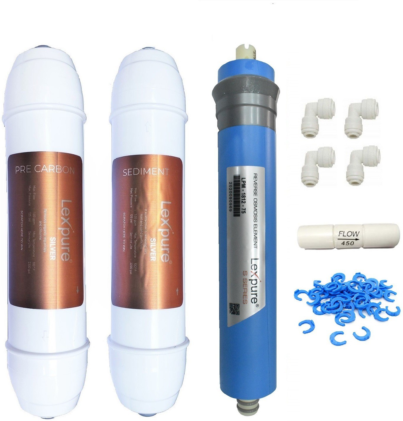 Lexpure Sediment and Carbon Filter Cartridges with 80 GPD Membrane,One Year RO Service Kit(Pack of 1pcs Sediment Filter , 1pcs Carbon filter, 1pcs 80 GPD Membrane With FR, 4pcs Elbow Connectors For Easy Installation) Suitable For All Kind Of Domestic RO Water Purifiers